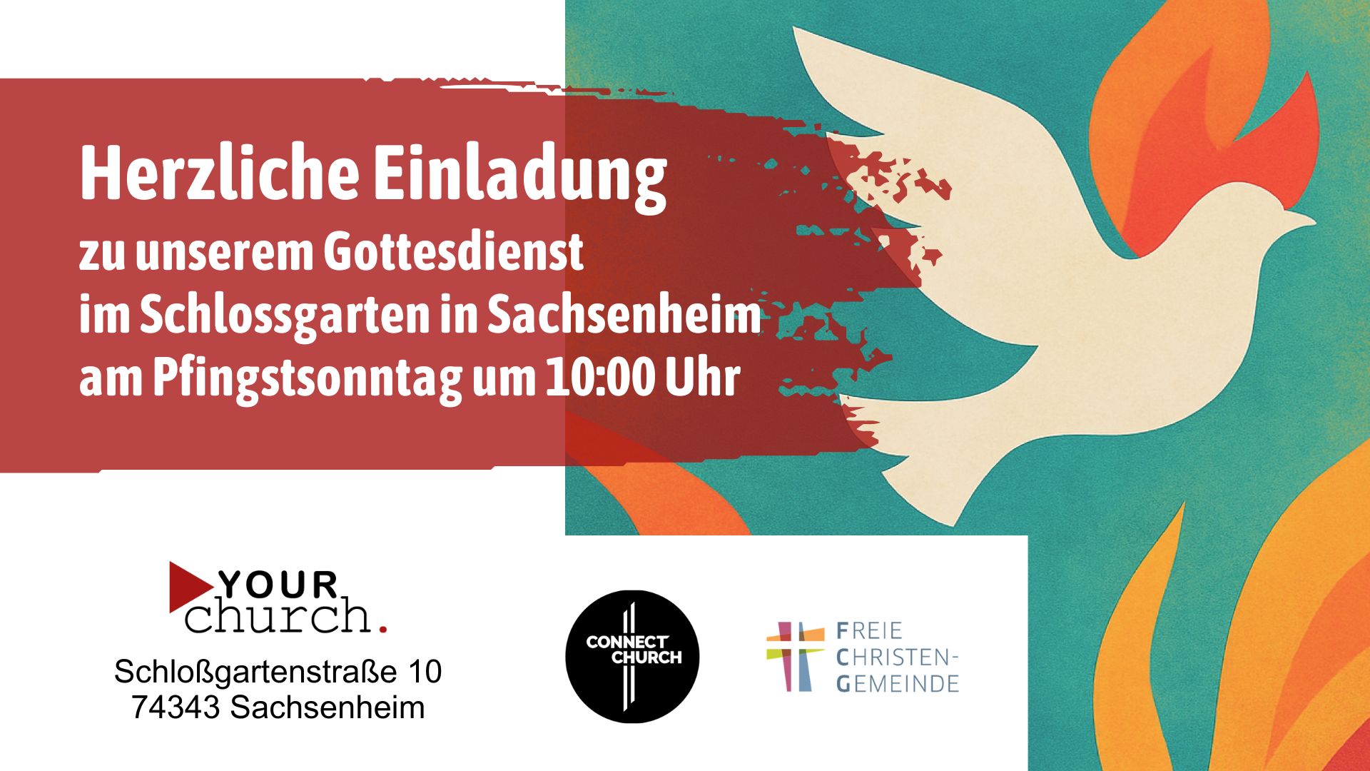 An Pfingsten feiern wir zusammen mit der FCG Erligheim und der Connect Church Bietigheim einen Open-Air-Gottesdienst im Schlossgarten in Sachsenheim. Zum Thema „Pfingsten HEUTE?!“ startet unser Gottesdienst an diesem Sonntag schon um 10:00 Uhr, die Kids Church findet parallel statt. Anschließend möchten wir bei einem Fingerfood-Buffet Gemeinschaft haben.