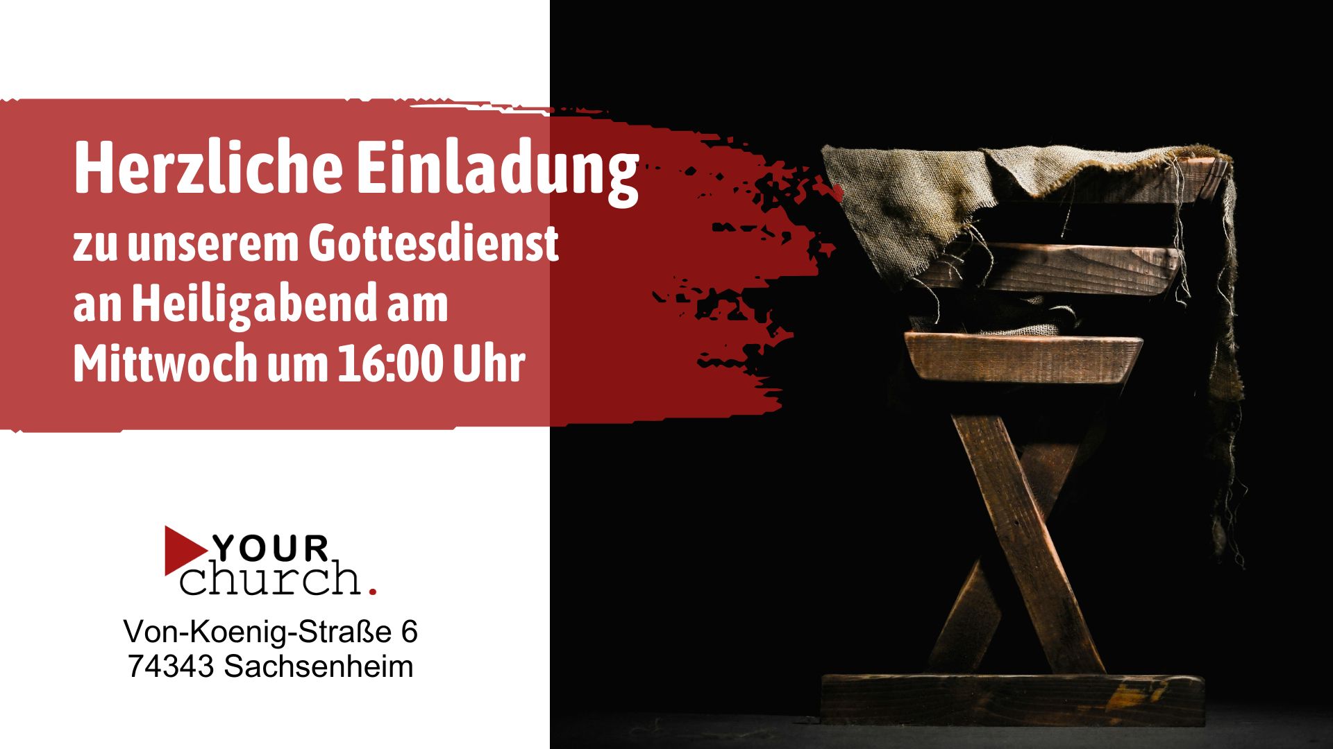 YOUR CHURCH Von-Koenig-Straße 6, Sachsenheim, DeutschlandWir möchten an diesem Tag einen besonderen Gottesdienst feiern. Treffpunkt ist wie gewohnt um 10:30 Uhr im Gemeindehaus, dort werden wir eine Kurzpredigt hören. Danach gehen wir gemeinsam auf den Weihnachtsmarkt, um dort präsent zu [...]