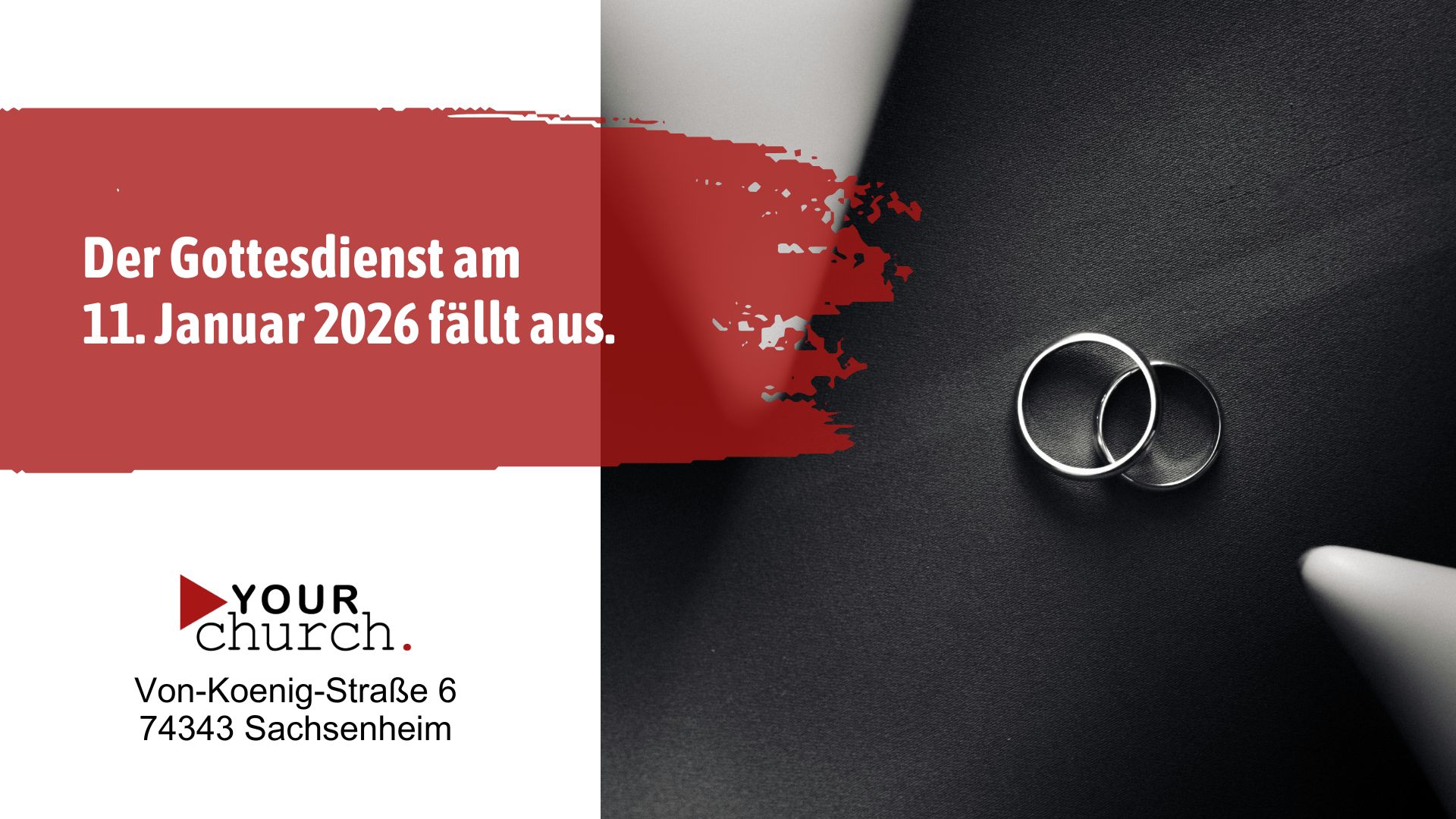 Wir dürfen am Samstag als YOUR CHURCH Gottesdienst auf einer Hochzeit feiern. Deshalb wird am Sonntag, den 11. Januar 2026, kein Gottesdienst im Gemeindehaus stattfinden. Wir freuen uns, euch am 18. Januar wieder zu sehen!